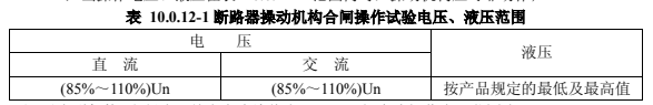 1)當(dāng)操作電壓、液壓在表 10.0.12-1 范圍內(nèi)時,操動機(jī)構(gòu)應(yīng)可靠動作;
